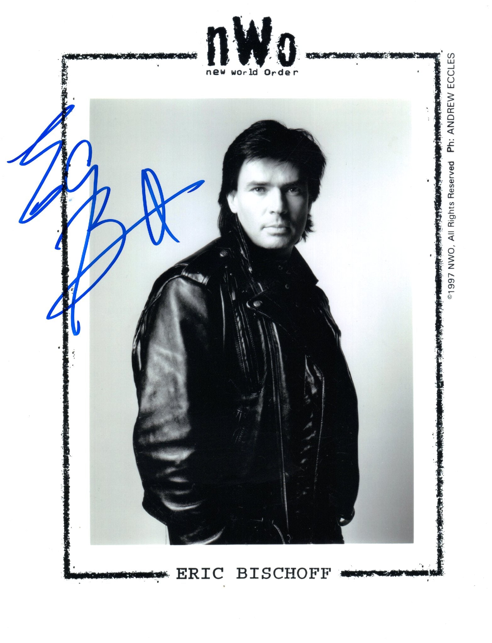 Eric Bischoff 8x10.  Ships in a toploader in between 2 pieces of cardboard.  THIS IS A COPY OF AN ORIGINAL PROMO, BUT IT IS A WET SIGNATURE.  IT IS NOT A REPRINTED AUTOGRAPH.